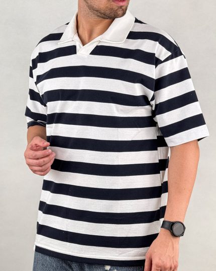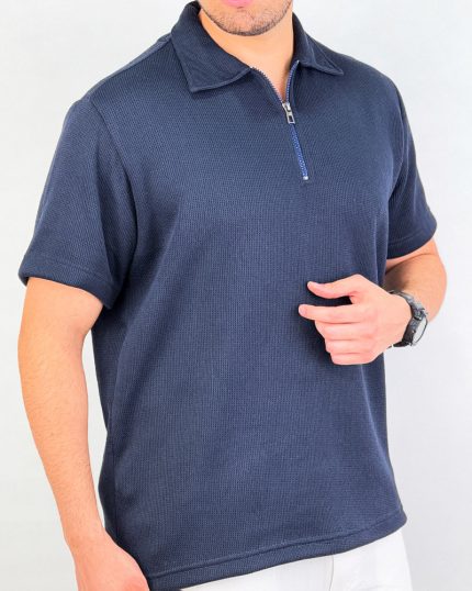 پلوشرت مردانه راه راه نیم زیپ لینن رنگ سرمه ای کد 69901